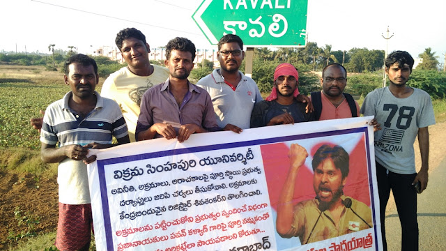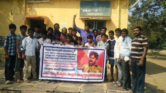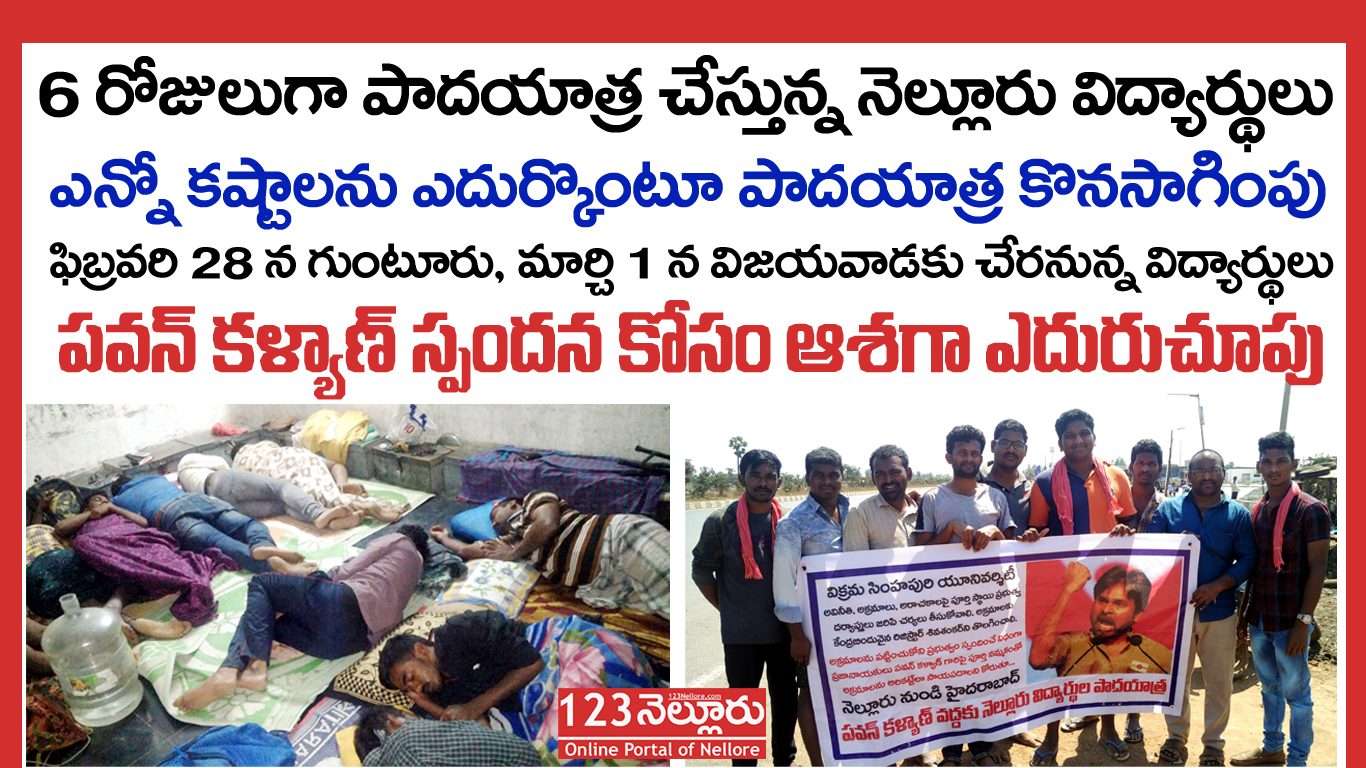 తమ యూనివర్సిటీ లో గత కొన్నేళ్లుగా ఎన్నో అక్రమాలు, అవినీతి, అరాచక వేధింపులు జరుగుతున్నా ప్రభుత్వం దృష్టికి ఎన్ని సార్లు తీసుకెళ్ళినా, ఎంతమంది పోరాటాలు జరిపినా ప్రభుత్వం స్పందించట్లేదని ఇక తమకు పవన్ కళ్యాణే దిక్కంటూ ఆయన స్పందించి తమ పోరాటానికి మద్దతిచ్చి ప్రభుత్వంలో చలనం తీసుకువచ్చేలా తోడ్పడాలని కోరుతూ నెల్లూరు నుండి పవన్ కళ్యాణ్ ను కలుద్దామని బయల్దేరిన నెల్లూరు విక్రమ సింహపురి యూనివర్సిటీ విద్యార్ధుల పాదయాత్ర ఆరో రోజుకు చేరింది. విద్యార్ధుల నుండి వస్తున్న సమాచారం మేరకు వారి పాదయాత్ర గుంటూరు జిల్లా చిలకలూరిపేట నగరం వరకు చేరింది. రోజుకి 30 నుండి 40 కిలోమీటర్ల మేర నడిచేందుకే చాలా ఇబ్బందిగా మారిందని, పలువురి కాళ్ళకు బొబ్బలు లేచాయని, పెయిన్ కిల్లర్ టాబ్లెట్లు వేసుకుంటూ, పెయిన్ రిలీఫ్ స్ప్రే లు కాళ్ళకు కొట్టుకుంటూ నడక కొనసాగిస్తున్నట్లు తెలిపారు. వేడి వాతావరణం కారణంగా విద్యార్ధులు విరోచనాల భారిన పడుతున్నట్లు తెలిపారు. అయినా కష్టాలను సైతం అధిగమిస్తూ తమ పాదయాత్రను కొనసాగిస్తున్నట్లు విద్యార్ధులు తెలిపారు.