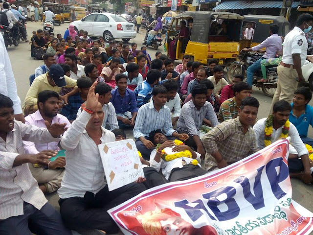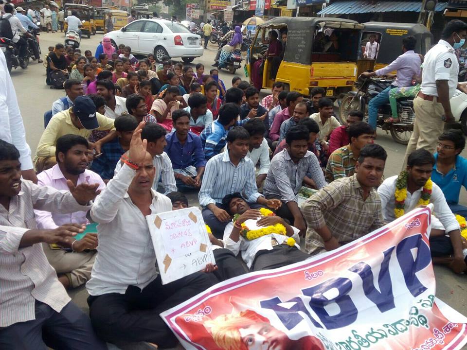 విక్రమ సింహపురి యూనివర్సిటీలో జరుగుతున్న అక్రమాలపై విచారణ జరిపించాలని, తక్షణం యూనివర్సిటీని నూతన భవనాల్లోకి మార్చాలని, అవినీతి రిజిస్ట్రార్ శివశంకర్ ను తొలగించాలని వీ.ఎస్.యూ శాఖ ABVP విద్యార్ధులు చేప్పట్టిన నిరవధిక నిరాహారదీక్ష మూడో రోజు ఉద్రిక్తంగా మారింది. మొదటి రెండు రోజుల్లో స్థానిక ఎమ్మెల్యేలు కోటంరెడ్డి శ్రీధర్ రెడ్డి, అనిల్ కుమార్ యాదవ్ మరియు బీజేపీ నాయకుల నుండి వీరికి మద్దతు లభించగా మూడో రోజు వర్శిటీ కళాశాల విద్యార్ధినీ విద్యార్ధులు స్వచ్ఛందంగా తరలివచ్చి మద్దతు తెలిపారు. మూడు రోజులుగా నిరవధిక దీక్ష చేస్తున్న విద్యార్ధుల శిబిరాన్ని పోలీసులు భగ్నం చేయబోతున్నారన్న వార్తల నేపథ్యంలో ABVP నాయకులతో కలిసి వర్శిటీ విద్యార్ధినీ విద్యార్ధులు వీఆర్సీ సెంటర్ లో రోడ్డు పై బైటాయించి తమ డిమాండ్స్ పై ప్రభుత్వం వెంటనే స్పందించాలని రాస్తారోకో చేపట్టారు. ఘటనాస్థలికి పోలీసులు చేరడంతో ఉద్రిక్త పరిస్థితులు ఏర్పడ్డాయి. వర్శిటీ వీసీ వచ్చి సమాధానం చెప్పే వరకు విద్యార్ధులు కదలమని బైటాయించారు. అంబేద్కర్ విగ్రహం ఎక్కి పెట్రోల్ పట్టుకుని ఆత్మహత్యాయత్నం చేశారు. దీక్ష కారణంగా నీరసించిన ఓ విద్యార్ధి సొమ్మసిల్లి పడిపోయాడు. ఈ క్రమంలో ABVP నాయకులను, విద్యార్ధులను పోలీసులు బలవంతం మీద అరెస్ట్ చేసి 4వ నగర పోలీసు స్టేషన్ కు తరలించారు. డీ.ఎస్.పీ వెంకటరాముడు జరిగిన పరిస్థితులపై సమీక్షించి తక్షణం విద్యార్ధుల వద్దకు రావాల్సిందిగా వైస్-ఛాన్సలర్ వీరయ్య ను కోరారు. పోలీస్ స్టేషన్ కు చేరిన వీరయ్య విద్యార్ధులను సముదాయించే ప్రయత్నం చేశారు. ఎమ్మెల్యే కోటంరెడ్డి శ్రీధర్ రెడ్డి, బిజెపి నాయకులు ఆంజనేయరెడ్డి, సురేందర్ రెడ్డి ల జోక్యంతో వైస్-ఛాన్సలర్ వీరయ్య దీక్షా స్థలికి చేరి విద్యార్ధులతో చర్చలు జరిపి దీక్ష విరమింపజేసారు. ABVP జాతీయ కార్యదర్శి సురేష్, వర్శిటీ ABVP విభాగం అధ్యక్ష కార్యదర్శులు సాంబ శివారెడ్డి, వెంకటేశ్వర్లు తదితరులు పాల్గొన్నారు.