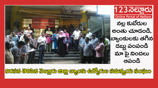 కేంద్ర ప్రభుత్వం తీసుకున్న పెద్ద నోట్ల రద్దు నిర్ణయం కారణంగా సామాన్య ప్రజలు తీవ్ర ఇబ్బందులు పడుతున్నారని, తాము అసౌకర్యానికి గురవుతున్నట్లు పేర్కొంటూ బుధవారం నాడు నెల్లూరు జిల్లా బ్యాంకు ఉద్యోగుల సమన్వయ సంఘం ఇచ్చిన పిలుపు మేరకు బృందావనం లోని ఆంధ్రాబ్యాంకు నెల్లూరు ప్రధాన శాఖ వద్ద వివిధ బ్యాంకుల ఉద్యోగులు నిరసన తెలియజేసారు.
