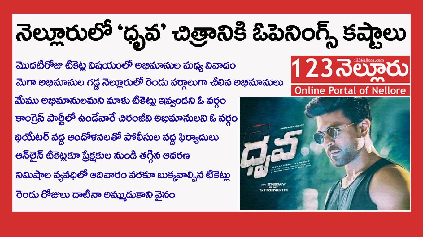 ఇదిలా ఉండగా ఆన్ లైన్ టికెట్ బుకింగ్ వెబ్ సైట్ లు అయిన JusTickets, Paytm లలో ‘ధృవ’ నర్తకి, సిరీ థియేటర్లలో టికెట్లు కొద్ది సంఖ్యలో అమ్మకానికి పెట్టారు. సాధారణంగా టికెట్లు ఆన్ లైన్ లో వదిలిన నిమిషాల వ్యవధిలోనే ఆదివారం వరకూ దొరక్కుండా అమ్ముడయ్యే టికెట్లు రెండు రోజులు దాటినా లభ్యమవుతున్నాయి. నోట్ల రద్దు కష్టాల నేపథ్యంలో ఇలాంటి పరిస్థితి ఏర్పడిందని పలువురు భావిస్తున్నారు. దీంతో ఇటు మొదటి రోజు టికెట్ల వ్యవహారంలో అభిమానుల మధ్య విబేధాలు, అటు ఆన్ లైన్ లో తగ్గిన ఆదరణతో రామ్ చరణ్ ‘ధృవ’ చిత్రం నెల్లూరు నగరంలో ఓపెనింగ్స్ కష్టాలను ఎదుర్కొంటున్నది.