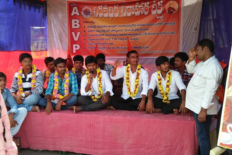 సంవత్సర కాలం క్రితం నిర్మాణాలు పూర్తై చేరడానికి సిద్ధంగా ఉన్న విక్రమ సింహపురి యూనివర్సిటీ నూతన భవనాల్లోకి వర్శిటీని మార్చకుండా తాత్సారం చేస్తున్నారని వెంటనే మార్చాలని డిమాండ్ చేస్తూ ABVP వీ.ఎస్.యూ విద్యార్ధులు నిరవధిక నిరాహార దీక్షను ప్రారంభించారు. ABVP వర్శిటీ విభాగం అధ్యకులు సాంబశివారెడ్డి, కార్యదర్శి దారా వెంకటేశ్వర్లు మాట్లాడుతూ వర్శిటీని నూతన భవనం లోకి మార్చకుండా ఆలస్యం చేస్తూ అద్దె భవనాలకు లక్షల రూపాయలు చెల్లించడంలో ఆంతర్యం ఏమిటని ప్రశ్నించారు. గత నాలుగు రోజులుగా దీనిపై పోరాడుతున్నా వర్శిటీ అధికారుల నుండి కనీస స్పందన కరువైంది అని అన్నారు. వర్శిటీ మార్పు పై లిఖితపూర్వక ప్రకటన ఇచ్చే వరకు దీక్షను విరమించేది లేదన్నారు. అదేవిధంగా వర్శిటీ లో ఖాళీగా ఉన్న టీచింగ్ పోస్టులను భర్తీ చేయాలని, ఇక్కడి అవినీతి అక్రమాలపై సీబిఐ విచారణ జరపాలన్నారు. విద్యార్ధుల మెస్ ఛార్జీల తగ్గింపు మరో డిమాండ్. వర్శిటీ కి యూ.జి.సి. 12 బి హోదా గుర్తింపు ఎప్పుడు వస్తుందని, అనేక అక్రమాలకు కేంద్ర బిందువుగా మారిపోయిన అవినీతి రిజిస్ట్రార్ శివశంకర్ ను ప్రభుత్వం ఎందుకు కొనసాగిస్తున్నదని తక్షణం తొలగించాలని డిమాండ్ చేసారు. ఈ కార్యక్రమంలో వర్శిటీ ABVP ఉపాధ్యక్షులు జయచంద్ర, ఇన్ ఛార్జి ప్రతాప్, జిల్లా కో-కన్వీనర్ కౌషిక్, రాజేష్ తదితరులు పాల్గొన్నారు.