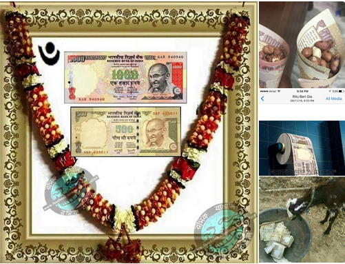 కేంద్ర ప్రభుత్వం తీసుకున్న సంచలన నిర్ణయం అవినీతిపరుల గుండెల్లో గునపంలా మారింది. సరైన ఆదాయపు వివరాలు లేకుండా అక్రమార్కులకు బ్యాంకుల్లో తమ డబ్బును మార్పు చేసుకునే వీలు లేదు. ఈ సందర్భంపై నెటిజన్లు సామజిక అనుసంధాన వేదికల్లో జోకుల రూపం లో తమ అభిప్రాయాలను వెల్లడిస్తున్నారు. చెల్లని నోట్లు చిత్తుకాగితాలుగా చిత్రీకరిస్తూ పల్లీలు, మిక్చర్ పొట్లాలు కట్టుకునే విధంగా రూపొందించి తమ ఖాతాల్లో షేరింగ్ చేస్తున్నారు. దాంతో పాటు సరదా వ్యాఖ్యలు కూడా చేస్తున్నారు.